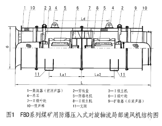 我公司生產(chǎn)的FBD系列礦用防爆壓入式對旋軸流局部通風(fēng)機,采用了這種技術(shù),可使風(fēng)機的運行噪聲不超過83dB(A),全壓效率達(dá)到88%,是一種理想的對旋式軸流通風(fēng)機。