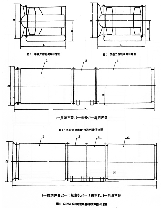 JK系列局扇的設(shè)計(jì),綜合考慮了各類局部通風(fēng)作業(yè)面所需的排塵排煙風(fēng)量、風(fēng)筒送風(fēng)距離、常用風(fēng)筒規(guī)格、風(fēng)阻值,以及礦井內(nèi)的使用條件等。JK系列局扇分為單級(jí)工作輪JK-1NO.(參見(jiàn)圖1)、雙級(jí)工作輪JK-2NO.(參見(jiàn)圖2)和對(duì)旋運(yùn)轉(zhuǎn)DJK等三類。JK40系列局扇(帶前、后消聲器)的機(jī)構(gòu)參見(jiàn)圖3,DJK系列對(duì)旋局扇(帶前、后消聲器)的結(jié)構(gòu)參見(jiàn)圖4。其中JK40系列局扇和DJK50系列對(duì)旋局扇可以直接安裝在巷道底板上,也可以懸掛安裝在巷道的幫壁上或頂板下。